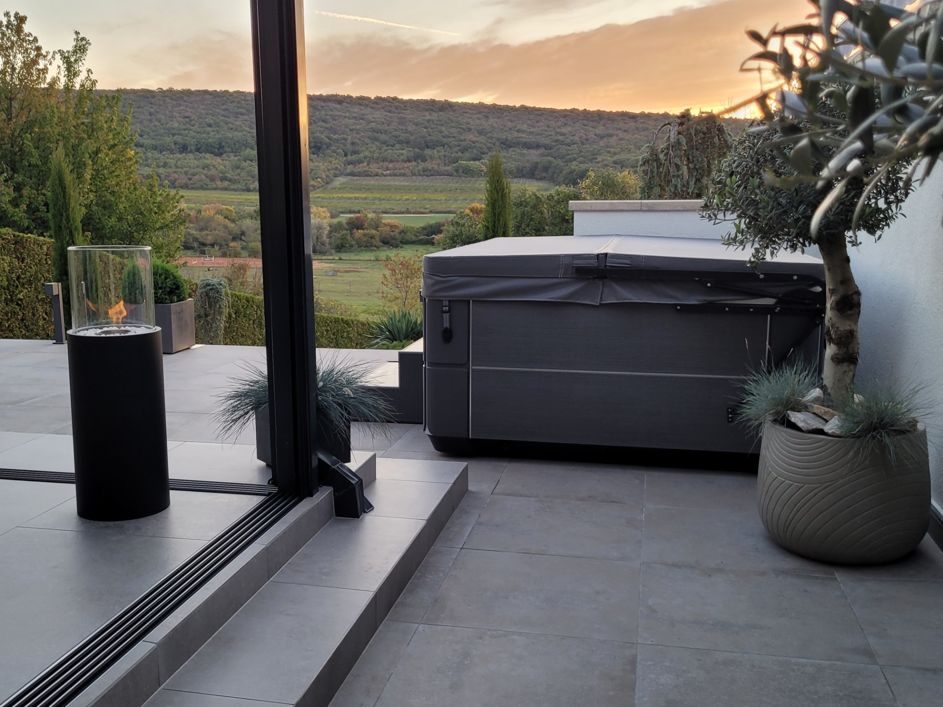 - A teraszt üvegfallal vettük körbe, mely szabad kilátást biztosít. Hűvösebb időben védelmet nyújt, a nyári melegben viszont a teljes fala nyitható. Kanapé, fotelek etanol kandallók a romantikus pihenéshez.