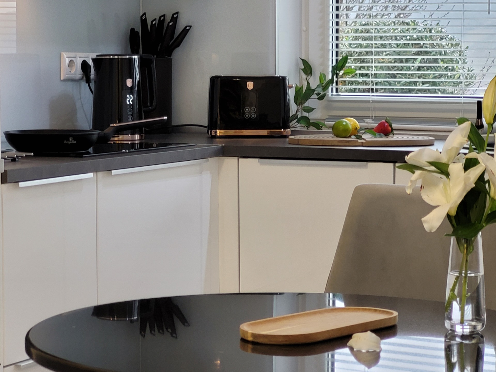 - Gépekkel felszerelt konyha (sütő, főzőlap, hűtő, mikró) automata kávégép, vízforraló, kenyérpirító,