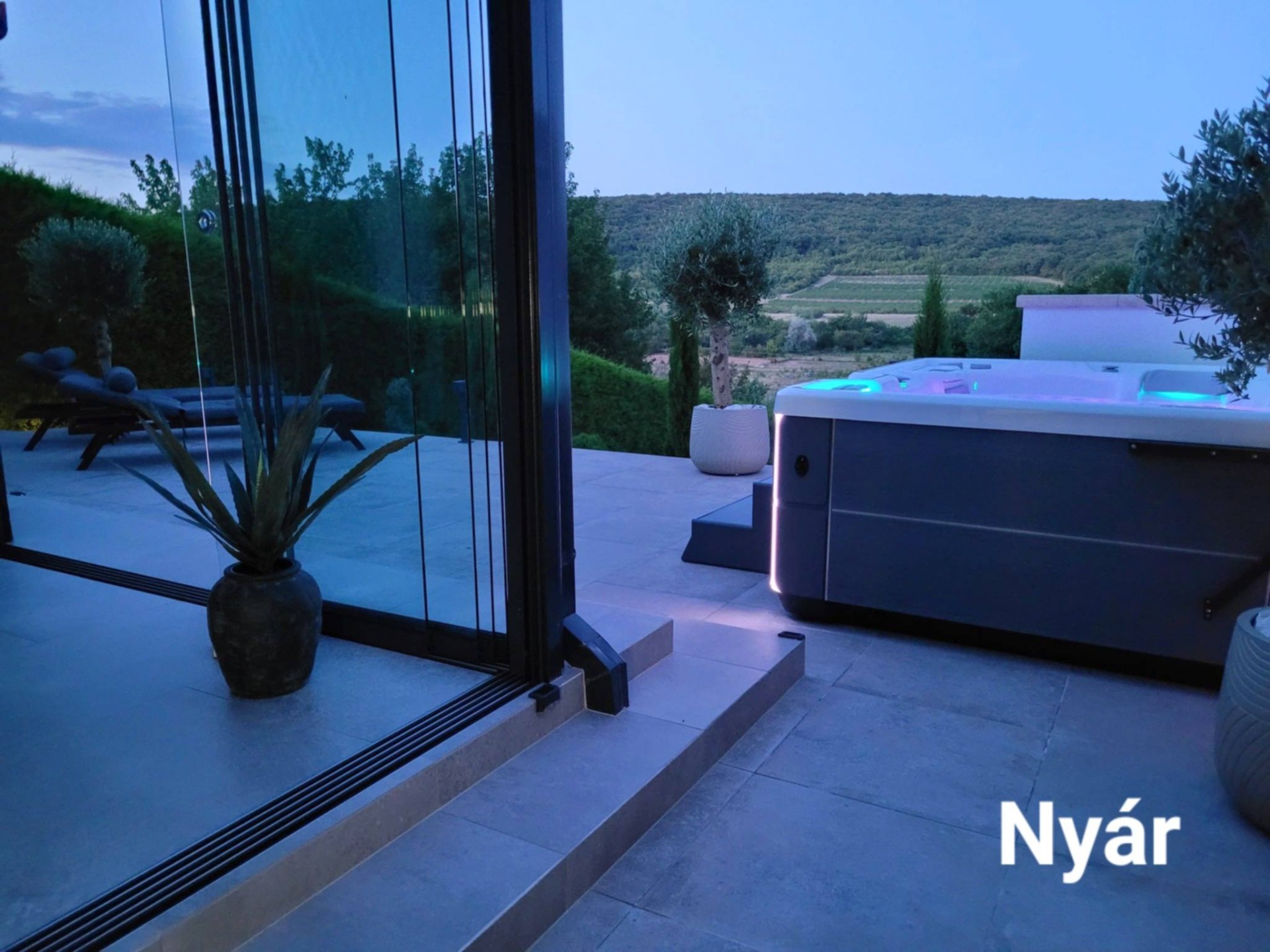 Kültéri Masszázsmedence és Finn szauna, ahonnan szabad kilátás tárul elétek a kertre és a környező dombokra, szauna előtt és után vagy a nyári hőségben, akár a kerti zuhany alatt is kellemesen felfrissíthetitek magatokat.
