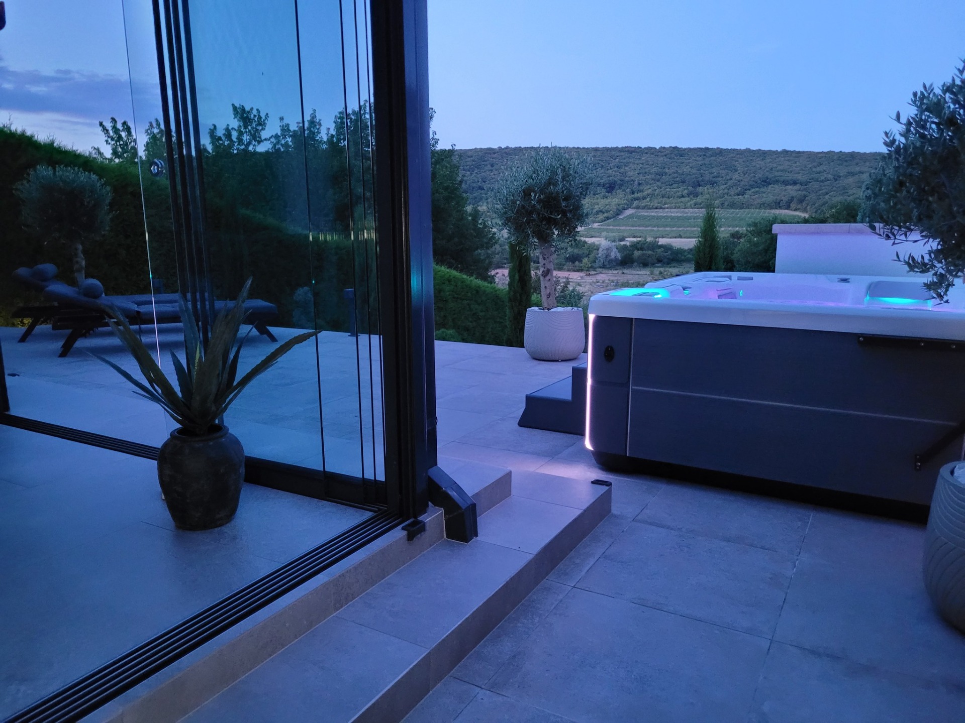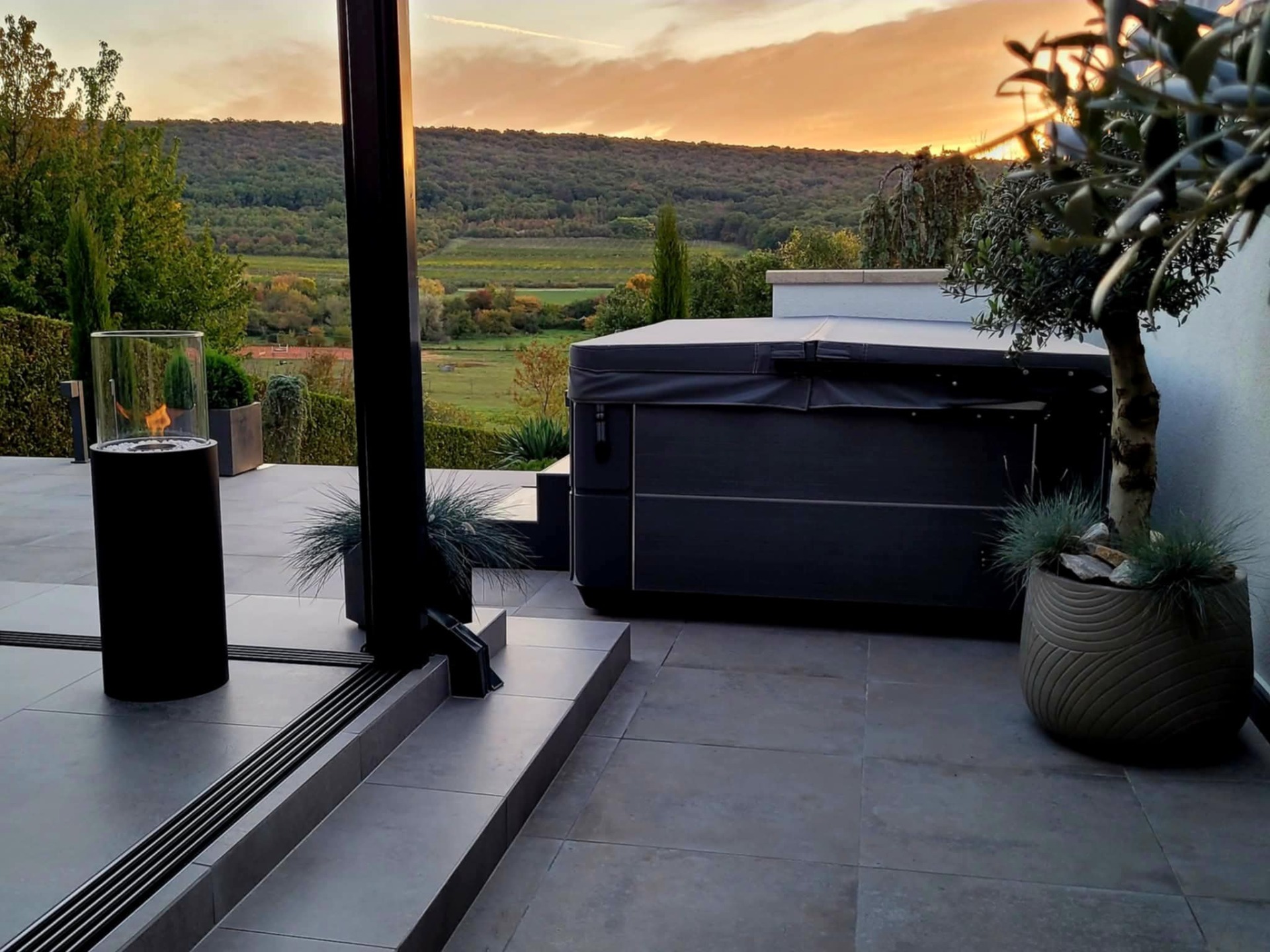 - A terasz mely szabad kilátást biztosít, hűvösebb időben védelmet nyújt, a nyári melegben viszont a teljes fala nyitható. Kanapé, fotelek etanol kandallók a romantikus pihenéshez.