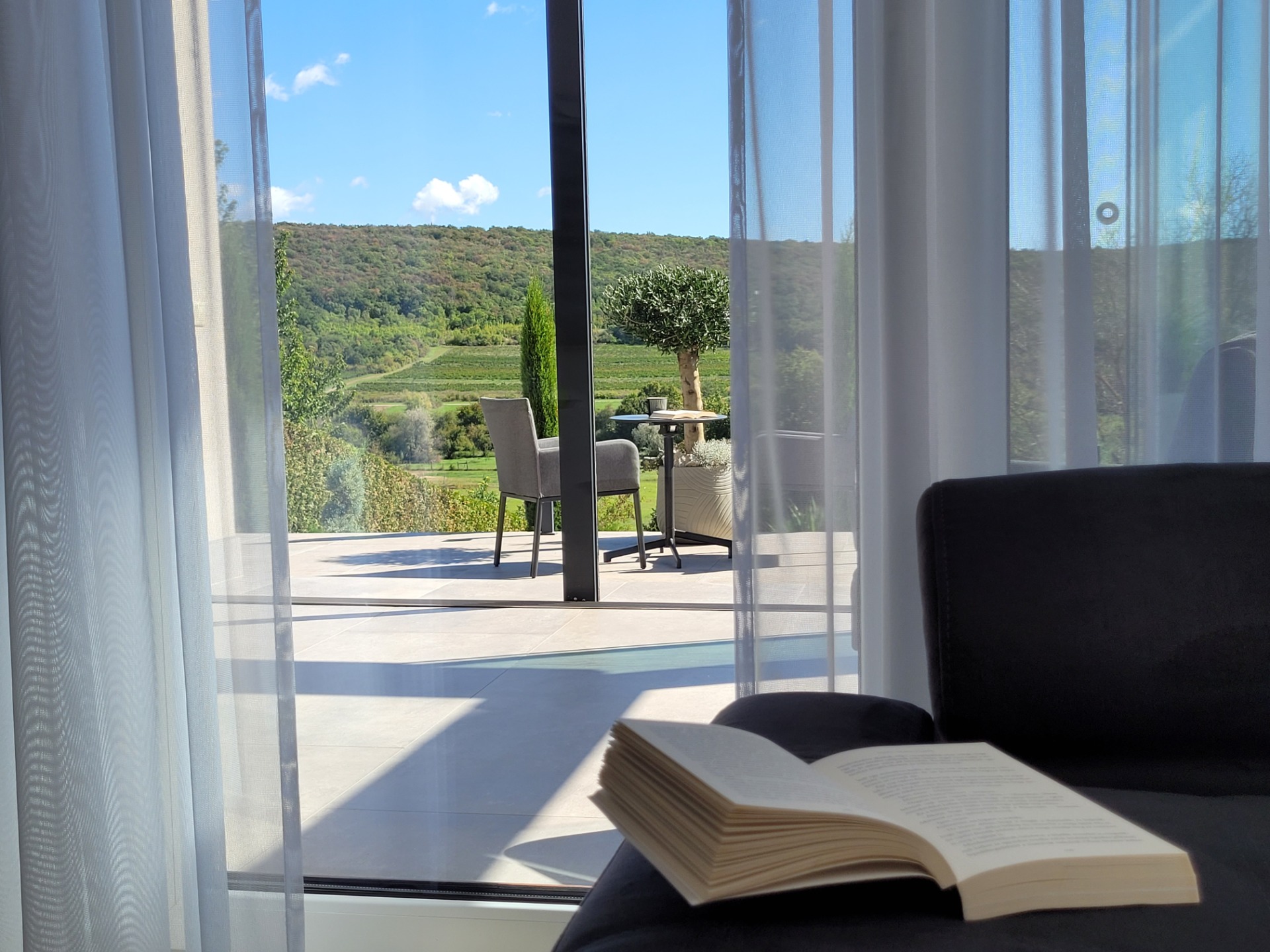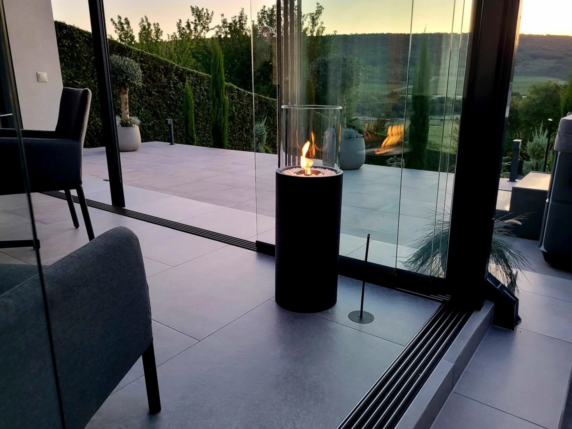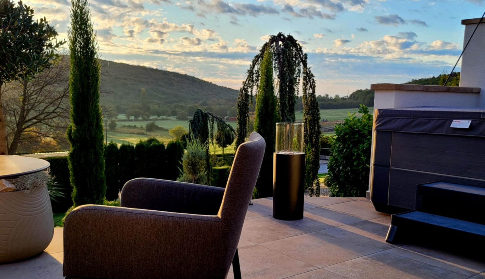 - A teraszt üvegfallal vettük körbe, mely szabad kilátást biztosít. Hűvösebb időben védelmet nyújt, a nyári melegben viszont a teljes fala nyitható. Kanapé, fotelek etanol kandallók a romantikus pihenéshez.