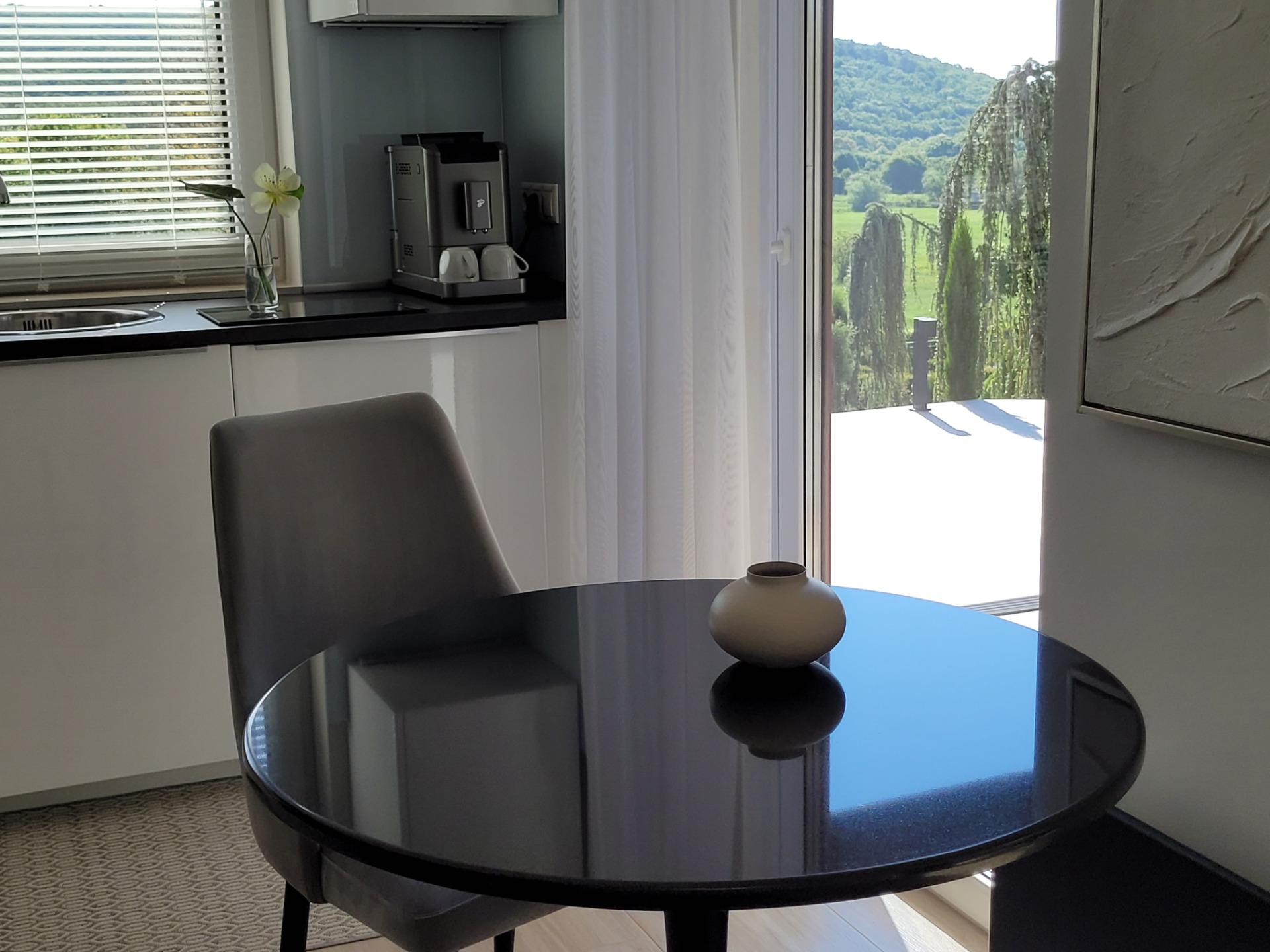 - Terasz mely szabad kilátást biztosít. Hűvösebb időben védelmet nyújt, a nyári melegben viszont a teljes fala nyitható. Kanapé, fotelek etanol kandallók a romantikus pihenéshez.